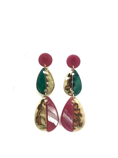 Pendiente en color rosa y verde con base en acero dorado. Con un círculo en color rosa para colocar en la oreja, está compuesto por dos piezas en forma de lágrima: la primera de 2.5 cms de largo; en metacrilato verde y acero dorado y la otra de 4.5 cms de largo; en metacrilato rosa y acero dorado. Cierre con tuerca a presión y pieza transparente de seguridad. Largo pendiente: 7 cms aprox.