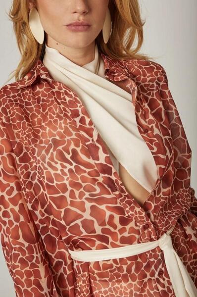 Camisa de la firma Masavi en estampado jirafa. Estampado jirafa de manga larga y bajo asimétrico. Viene incorporado un top bandeau que lo puedes atar con una lazada. Una prenda muy especial y única, con la que puedes marcar tendencia.