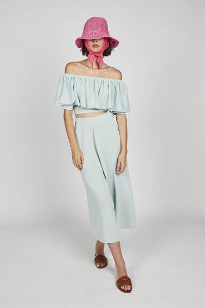 Pantalón de la firma Montoto en color azul. Pata ancha con cinturilla amplia con dos costuras y cinturón fino para ceñir la prenda al gusto con una bonita lazada sencilla. Bajo en tubular.