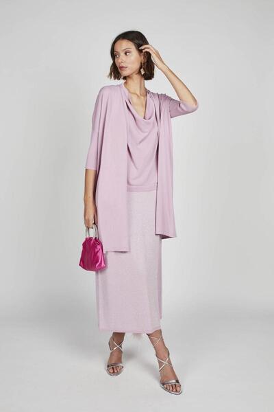 Chaqueta de la firma Montoto en color rosa. Punto larga con manga murciélago. Puños largos en canalé y bajos en tubular.