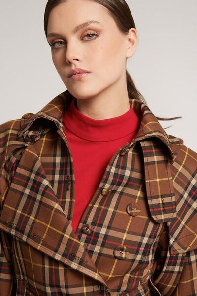 Gabardina Highly Preppy Cuadros Camel, Gabardina de cuadros de fondo marrón, con rojo y amarillo, de capucha y volante desmontable, de traspaso, con bolsillos de plastón y cinturón.