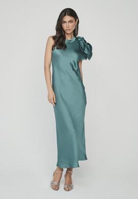 Vestido de la firma Oky en color fucsia. Cuello halter y manga sisa con una pequela abertura en la parte delantera. Volante en el bajo.