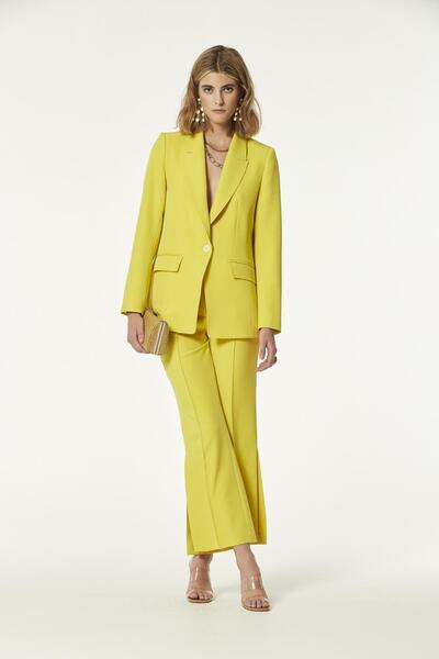 Chaqueta de la firma Oky en color amarillo. Cuello solapa. Cierre delantero con botón blanco y bolsillos con solapa , . Hombros con guata, manga larga y bajo con aberturas. Espalda con corte central y costadillos.