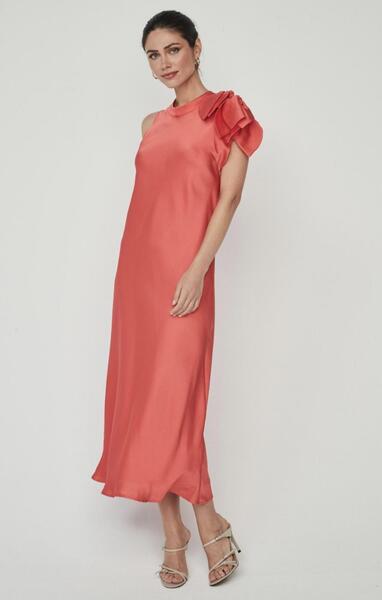 Vestido de la firma Unlimited. Midi, satinado con cinturón y flor en el hombro.