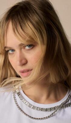 Camiseta de cuello redondo y manga corta, con piedras brillantes en el cuello que añaden un toque chic y elegante.