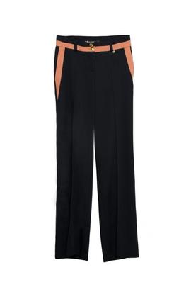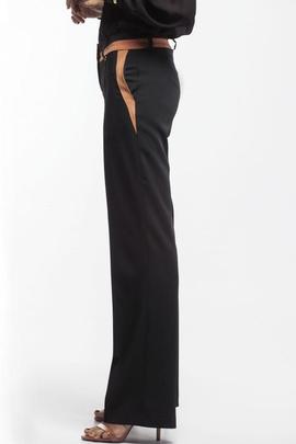 Pantalón en color negro de Masavi. Corte recto y holgado. Con raya central marcada con pespunte. Cintura ancha con dos colores, negro y maquillaje, al igual que los bolsillos laterales que están rematados con una cinta en color maquillaje. Cierre delantero con dos botones dorados redondos con la inscripción MASAVI y una cremallera con tapeta. La cintura tiene cinco trabillas grandes.